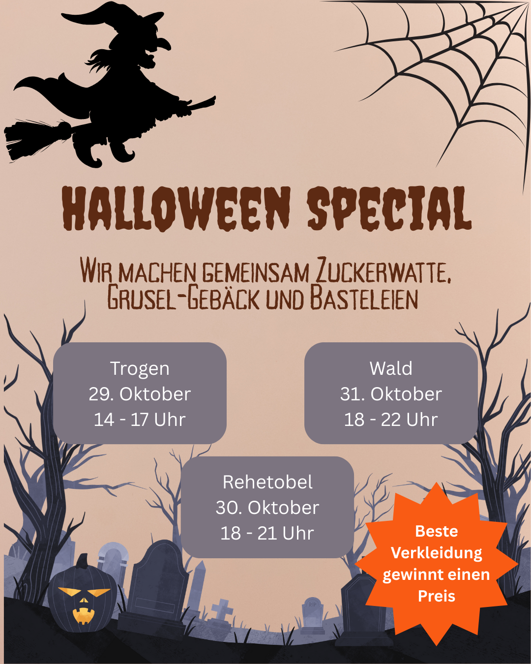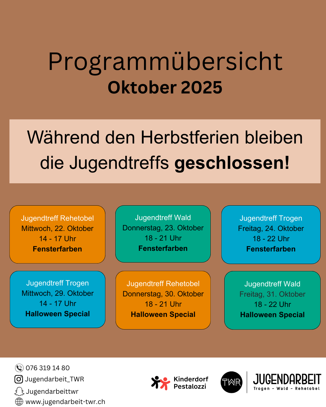 Die Jugendtreffs in Trogen, Wald und Rehetobel haben alternierend an folgenden Tagen geöffnet. Im Monatsplan oben sind die Tage angegeben.